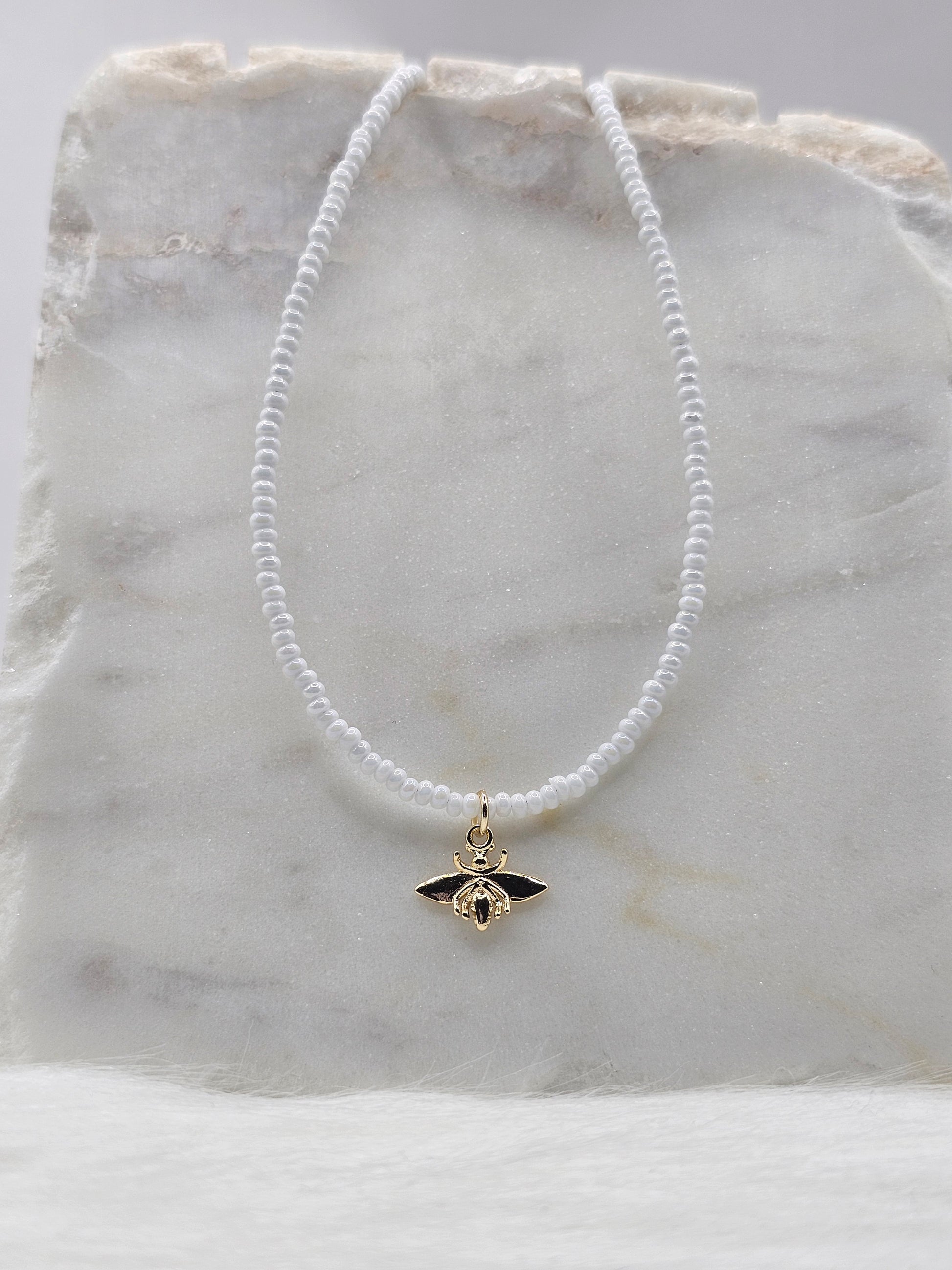 Handcrafted with white glass seed beads on a tiger tail wire, this delicate piece reflects the purity of clouds and the warmth of sunlight. The gold-tone bee pendant, made from tarnish-free metal, brings a touch of nature’s charm, symbolising harmony, growth, and life’s sweet moments.